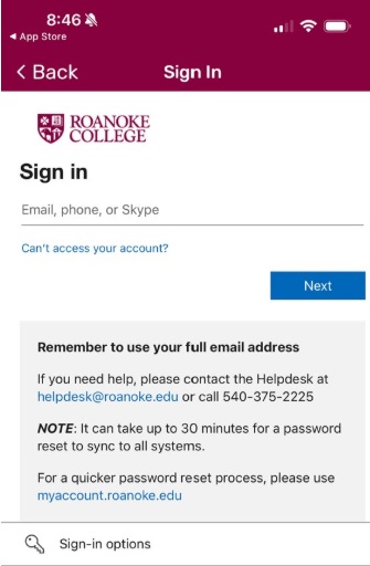 - You will be taken to the Roanoke College Portal and will need to sign in with your Roanoke College EMAIL, PASSWORD as well as 2FA confirmation.