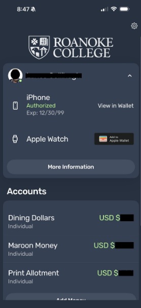 - You will land on your account page. If your account Pic has not been approved you will not see it here and you will not be allowed to add your Maroon Card to your wallet until that is completed. Submit a picture here. You will see your available accounts and balances of various funds attached to your Maroon card. And here you can see what devices your Maroon Card is attached to and add it to new devices like an Apple Watch or tablets if desired.
