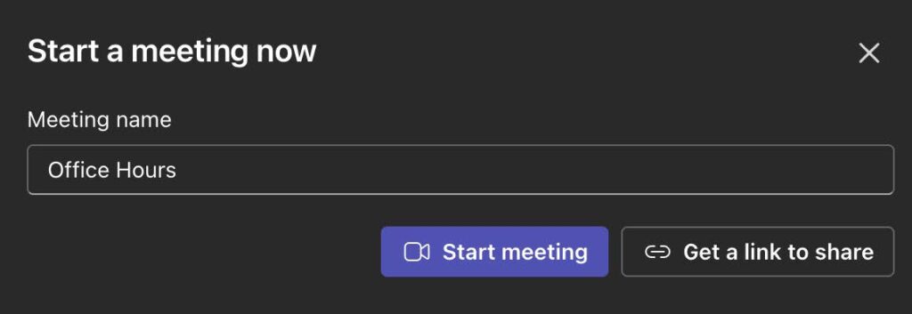 share from the Teams Calendar by clicking “Meet Now,” then “Get a link to share”. This provides